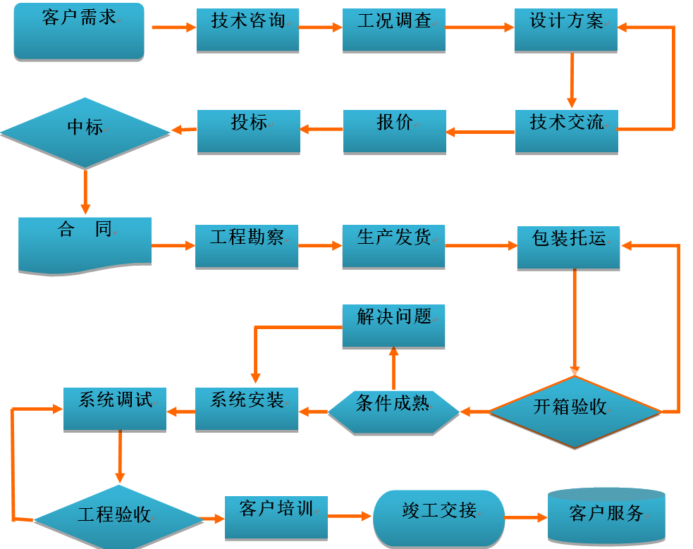 我公司經(jīng)過多年的經(jīng)驗總結(jié),形成了一套完整合理的客戶服務流程體系,服務流程包括銷售服務、系統(tǒng)設計、采購、生產(chǎn)、檢驗、工程實施、投運、維護等各個環(huán)節(jié)。公司對相關(guān)的服務流程持續(xù)的完善和優(yōu)化,使系統(tǒng)服務的質(zhì)量管理更加標準化、程序化、規(guī)范化,為系統(tǒng)服務工作奠定了扎實的基礎。