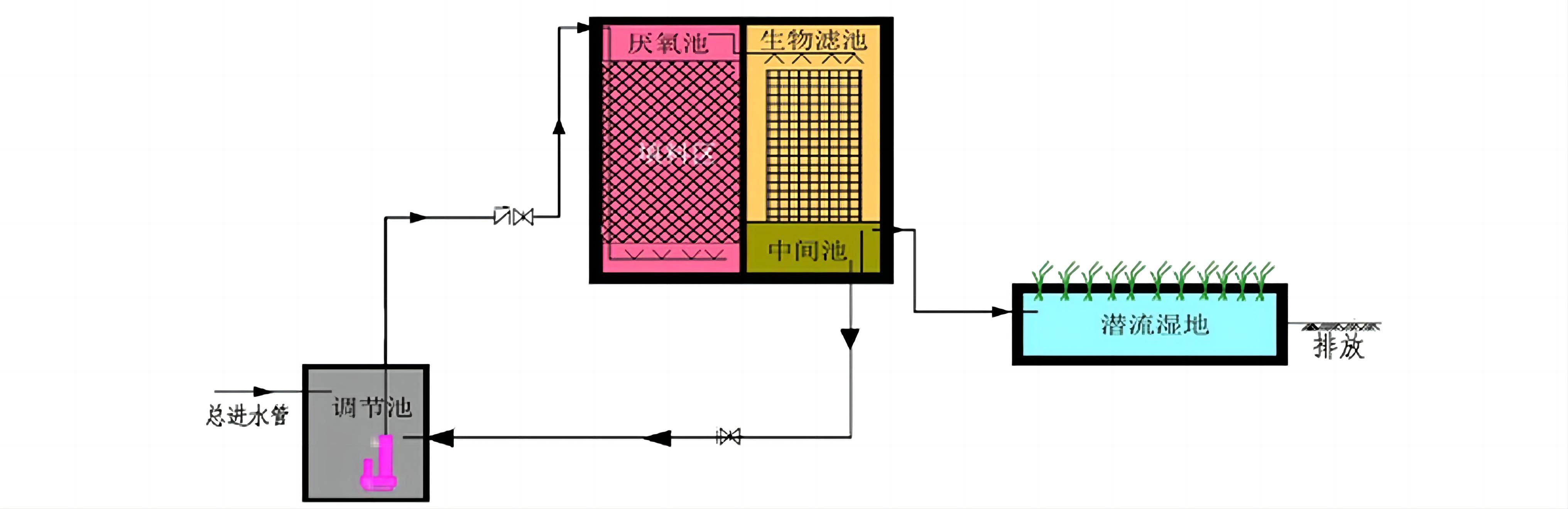 工藝原理∶模塊化分層生物滴濾池屬于生物膜法污水處理工藝范疇,主要由集水池、復(fù)合濾床、中間池、人工濕地等部分組成。通過特殊強(qiáng)化濾料進(jìn)行生物和生態(tài)處理實(shí)現(xiàn)污水達(dá)標(biāo)處理。